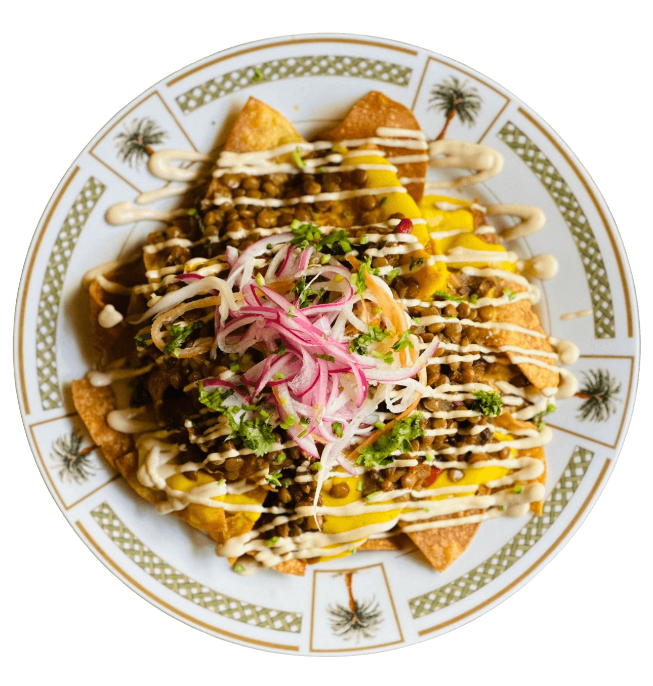 Passiflora's famous vegan nachos, made with freshly fried corn chips, lentil "meat", root-vegetable cheese, cashew sour cream, pico de gallo and pickled onions.