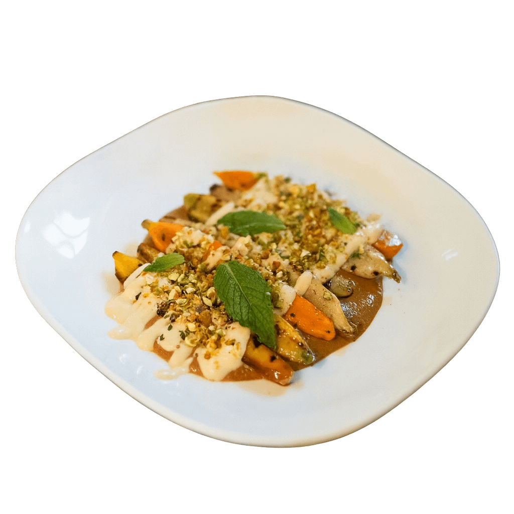 Roasted carrots resting in a house-made mole crafted from our neighbors Jeanmarie cacao, with notes of fresh rosemary and thyme, finished with cashew sour cream and roasted pistachios.