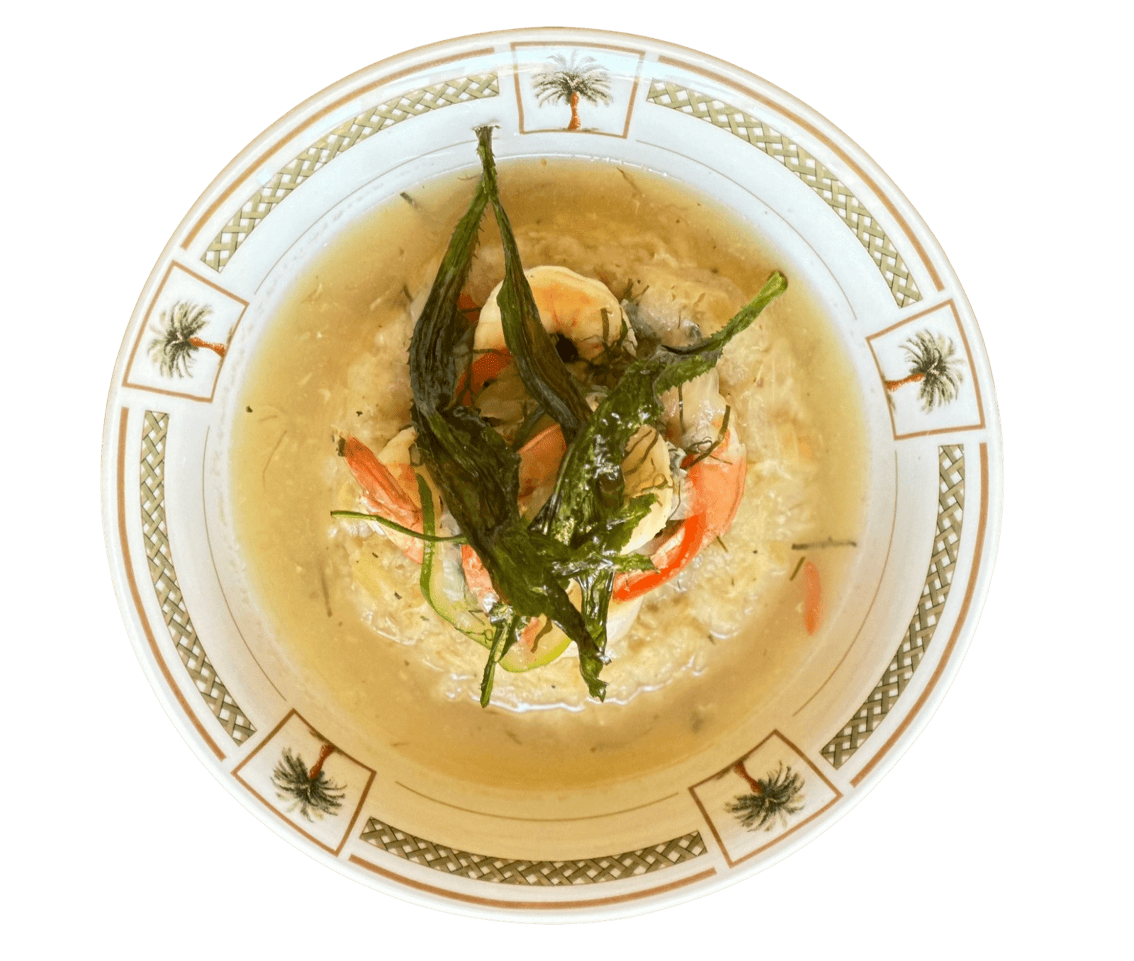 Golden yuca mofongo served in a velvety broth of garlic, butter, vegetables, and fresh coriander.